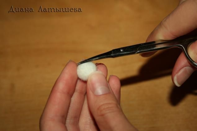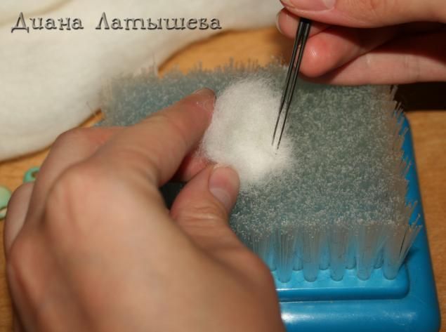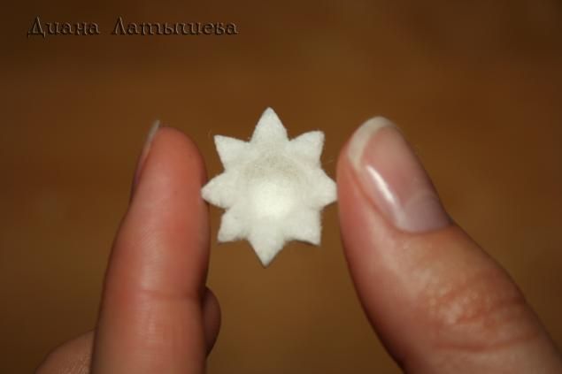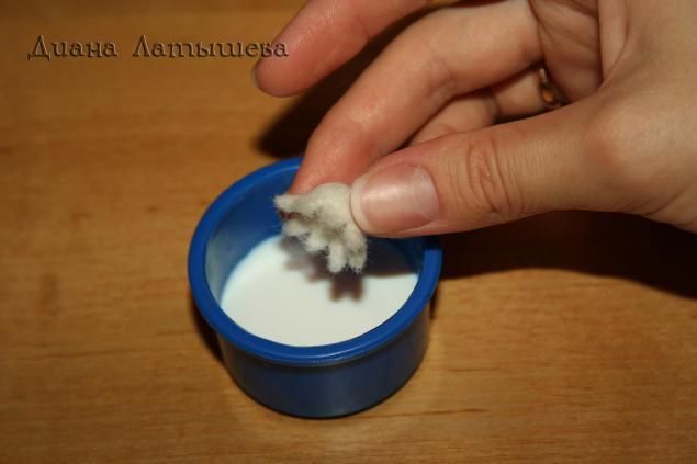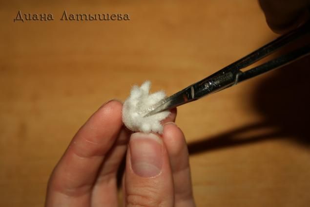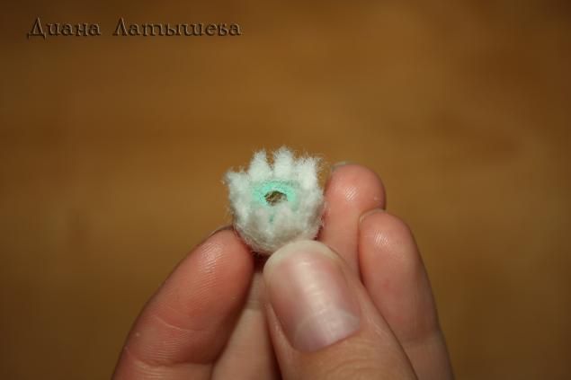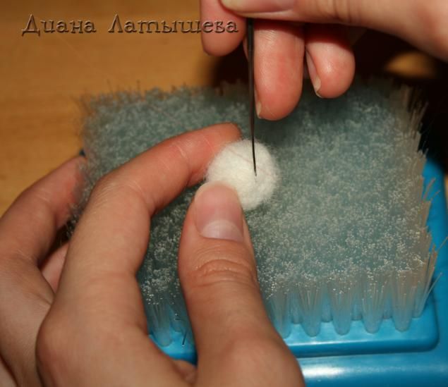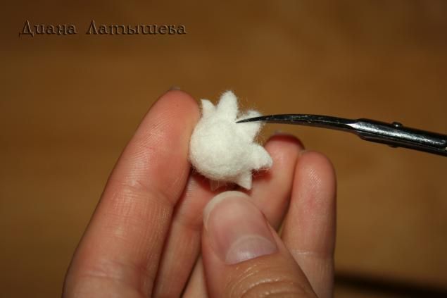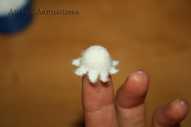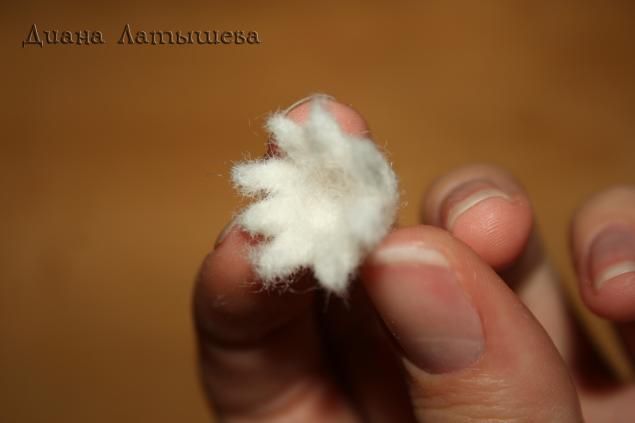 Берем маленькую прядь шерсти белого цвета. Валяем кружок, а затем формируем «тарелочку»