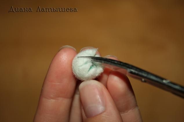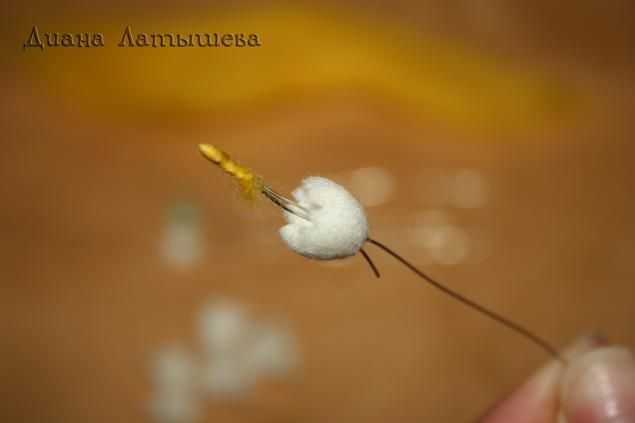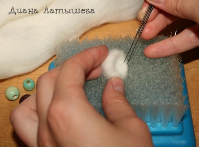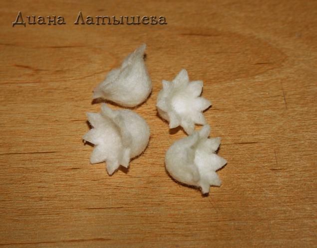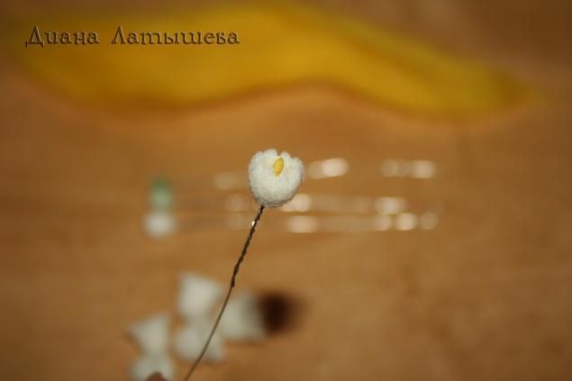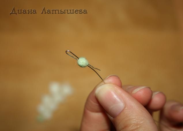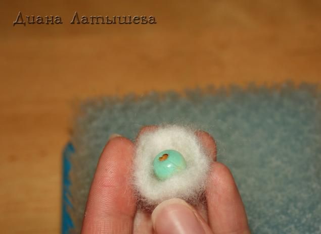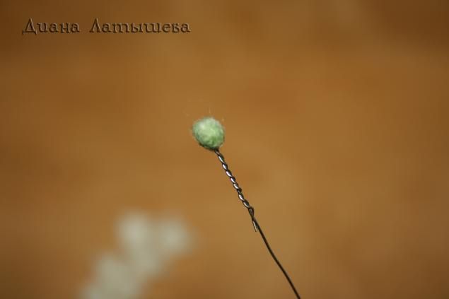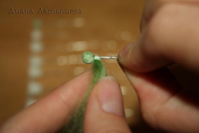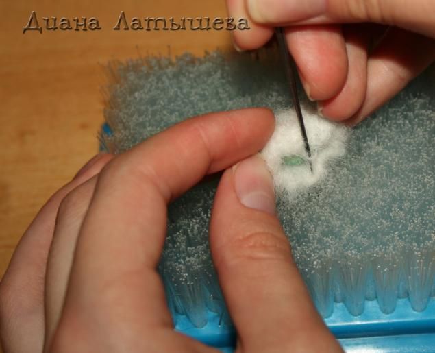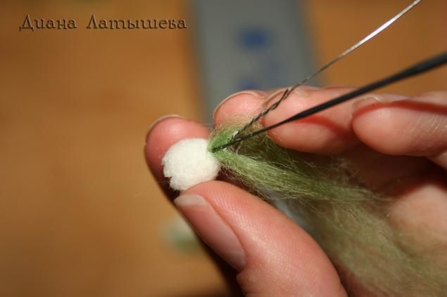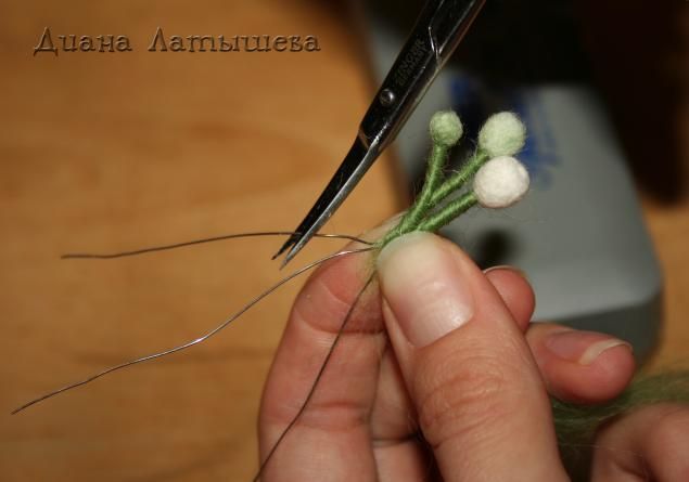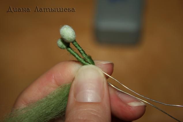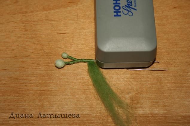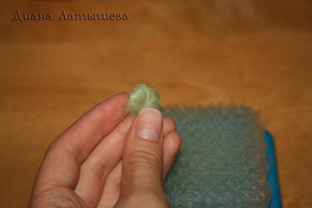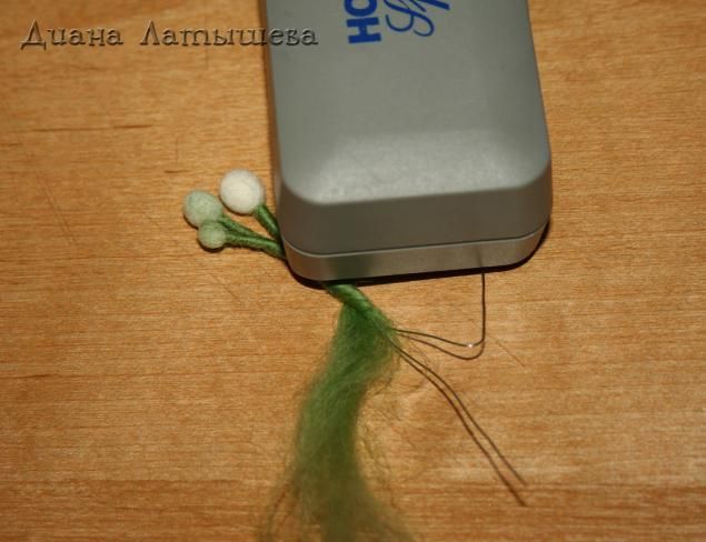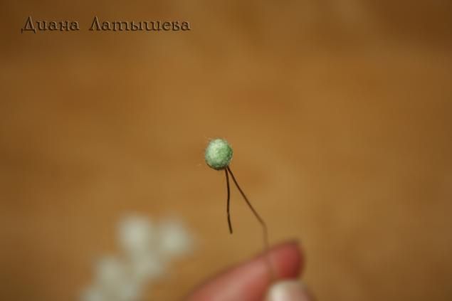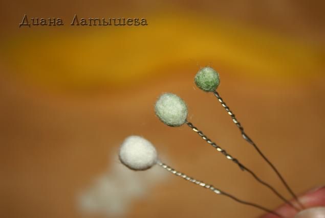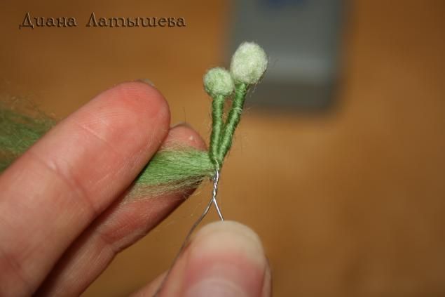Для бутончиков необходимо добавить к белому- шерсть зеленого цвета. Формируем маленькие шарики иглой.