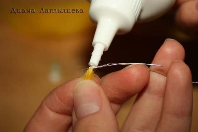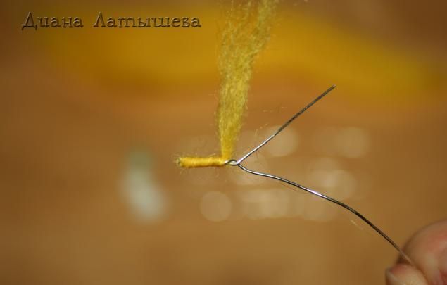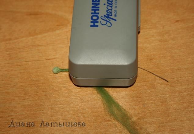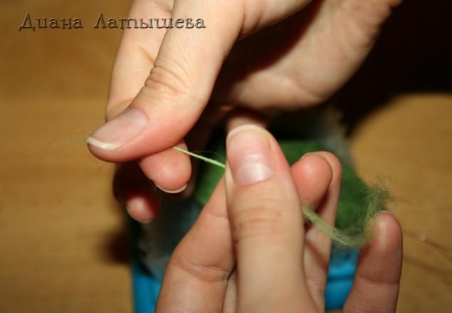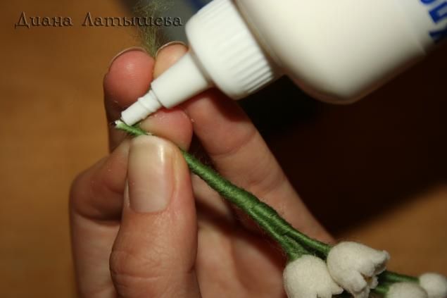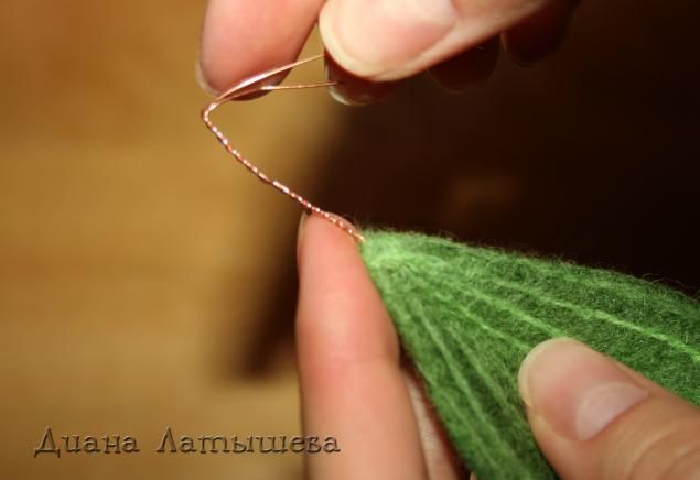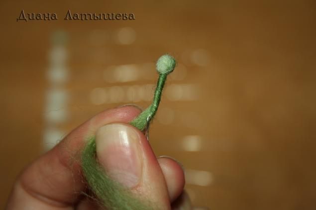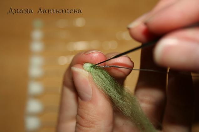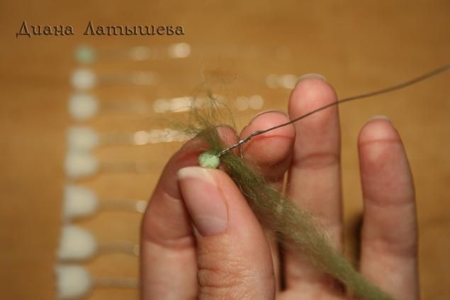 Наносим клей ПВА и берем прядку шерсти зеленого цвета. Обматываем проволоку.