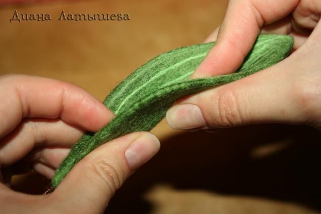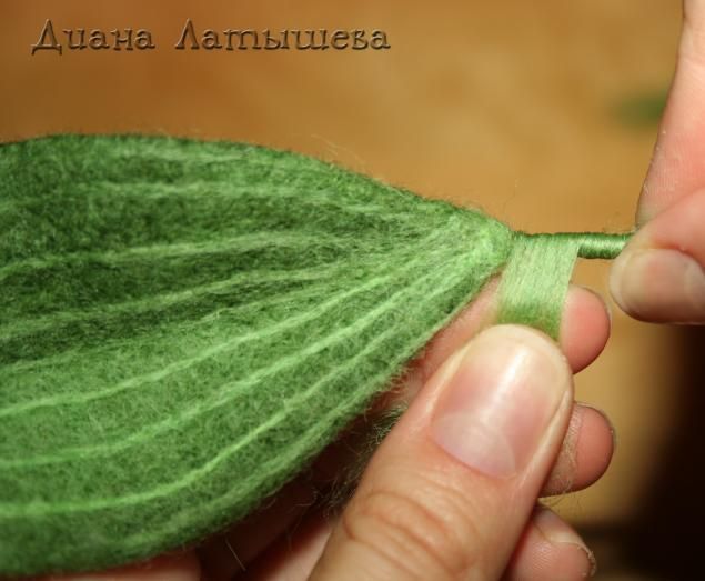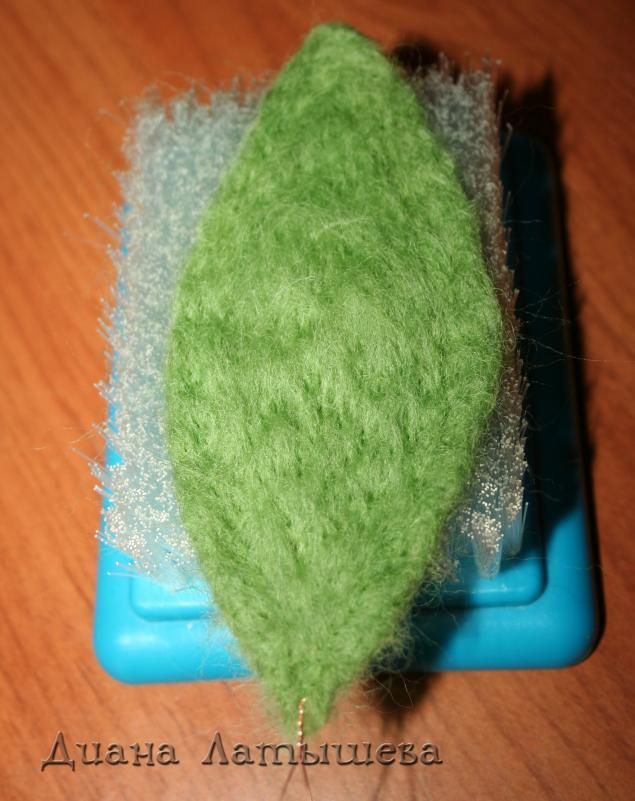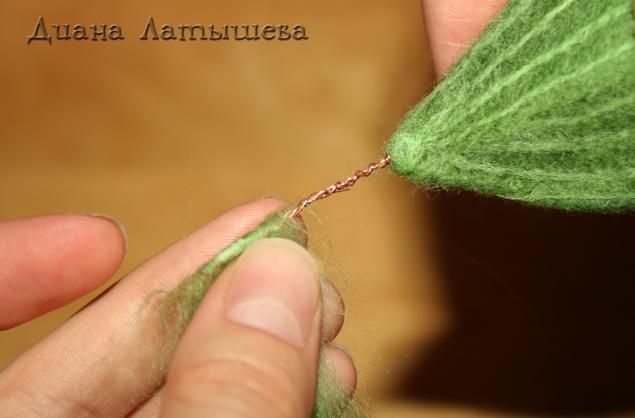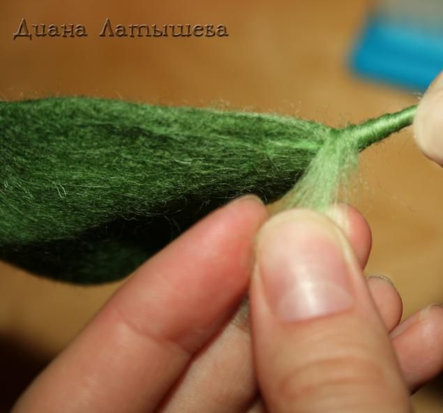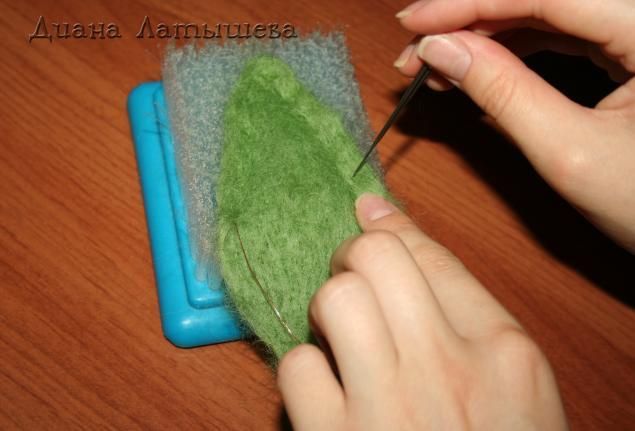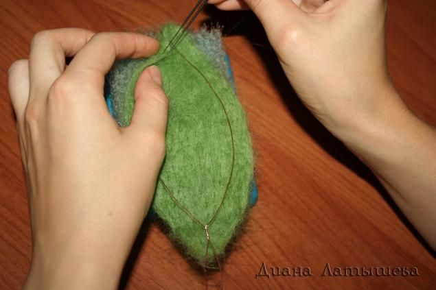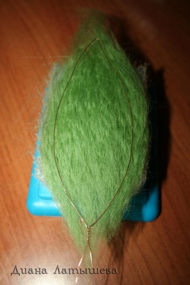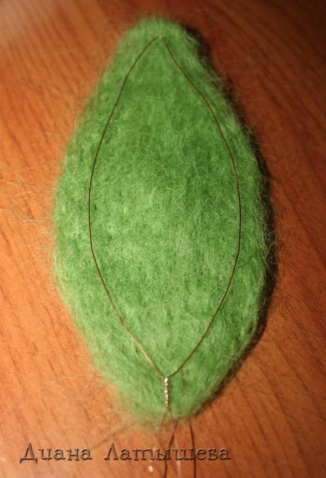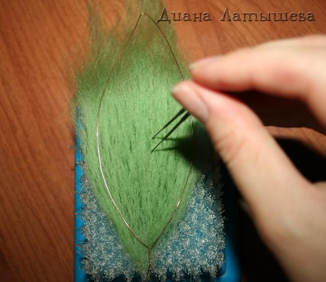 Кладем поверх нашего листика проволочный каркас, подворачиваем шерсть так, чтобы закрылась проволока и валяем.