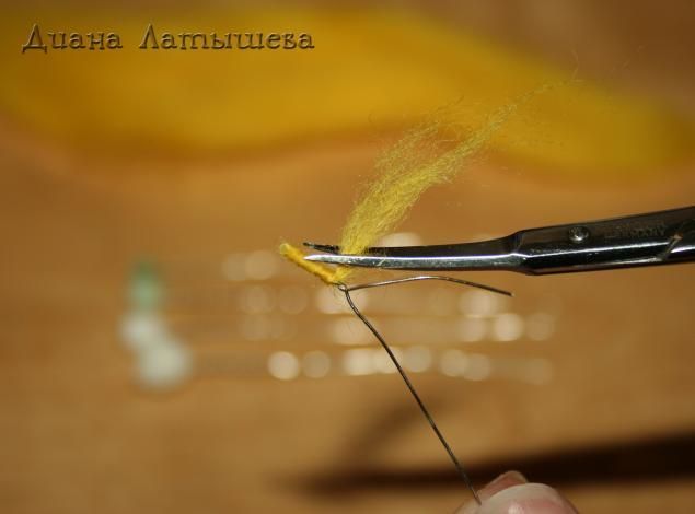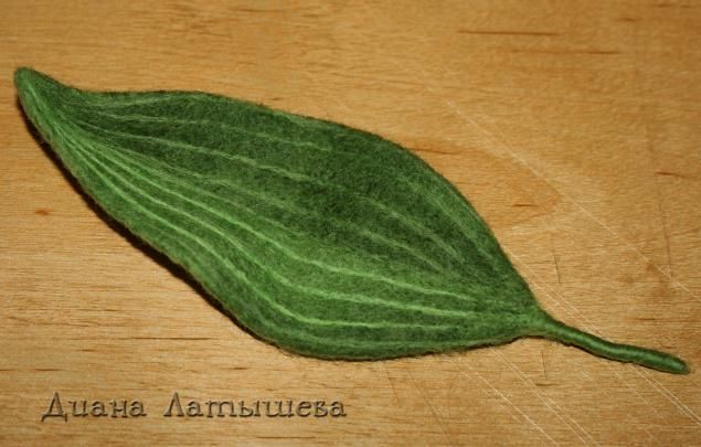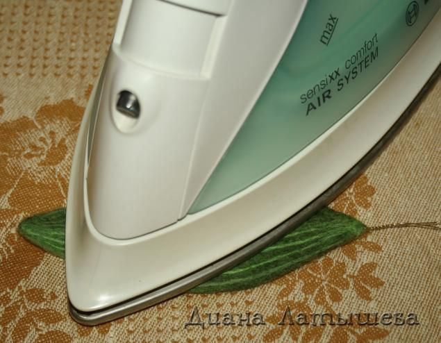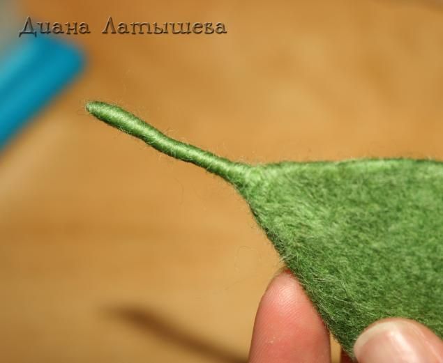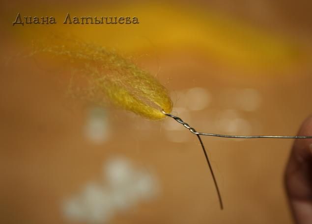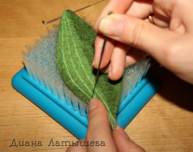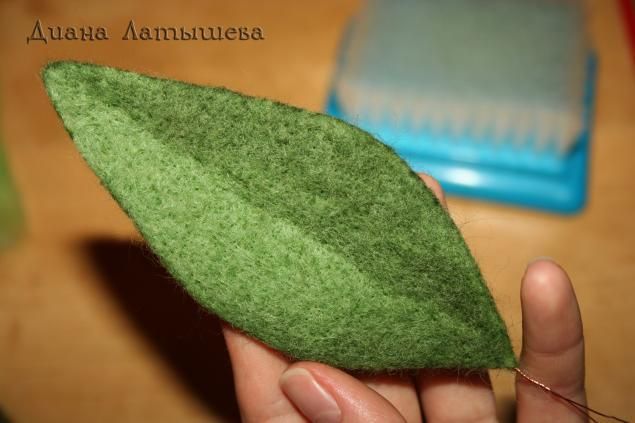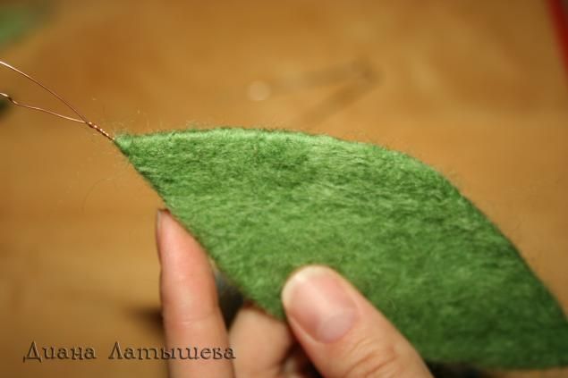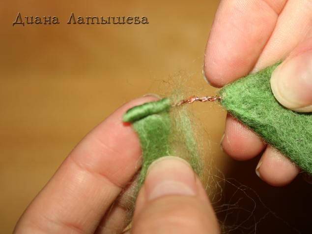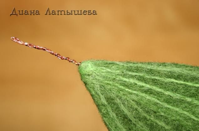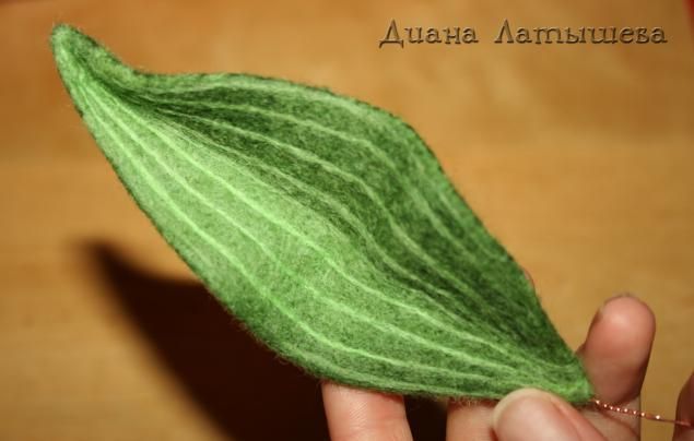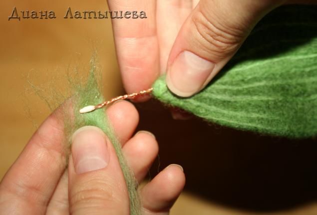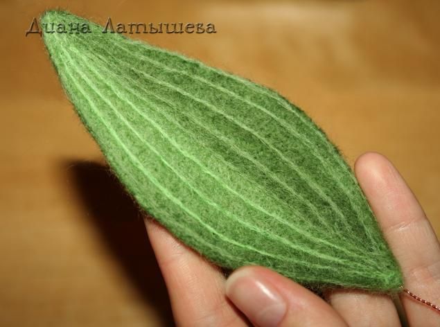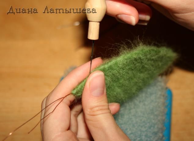 Кладем поверх нашего листика проволочный каркас, подворачиваем шерсть так, чтобы закрылась проволока и валяем.