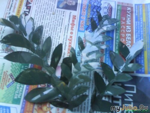 Вырезаем разные листочки, как подскажет фантазия. Окрашиваем в зеленый цвет ( напомню, что зеленый цвет можно получить, если смешать синюю и желтую краску в равных пропорциях).