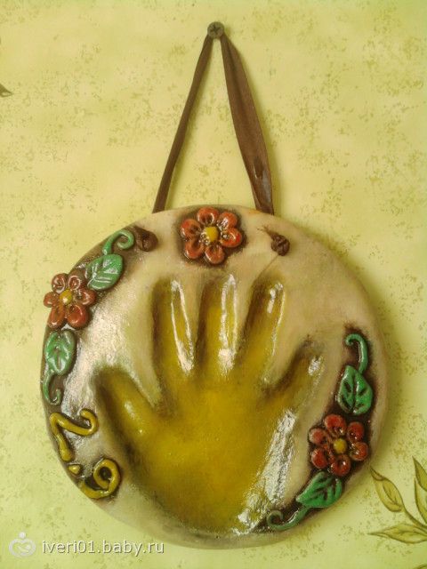 Думаю да ну уж нафиг, руки у меня вроде из нормального места растут, попробую-ка я сама что-нибудь смастерить. Ну и полезла в кладовые интернета, нашла конечно много всяких статей, мастер-классов и т.д. и т.п. и решилась сделать «медальку» с отпечатками ручонок и ножек.