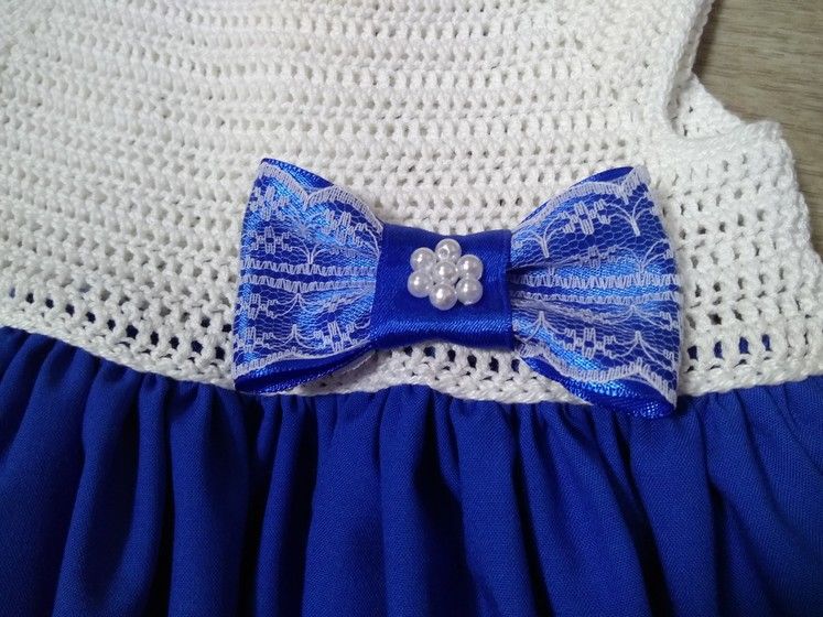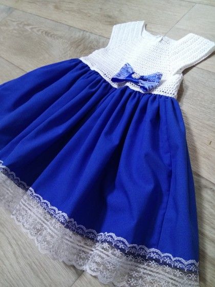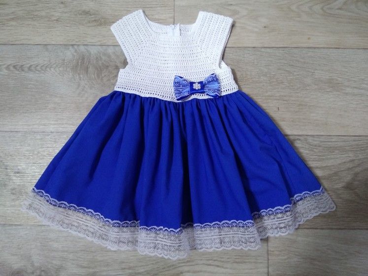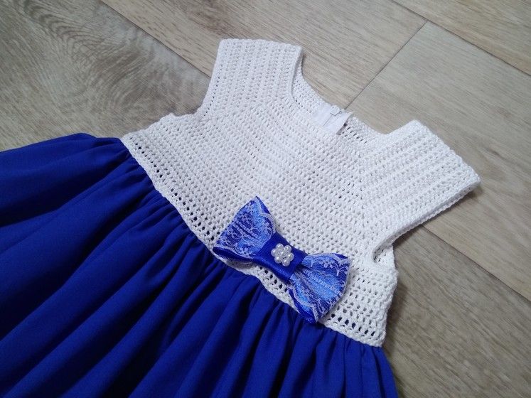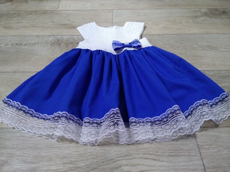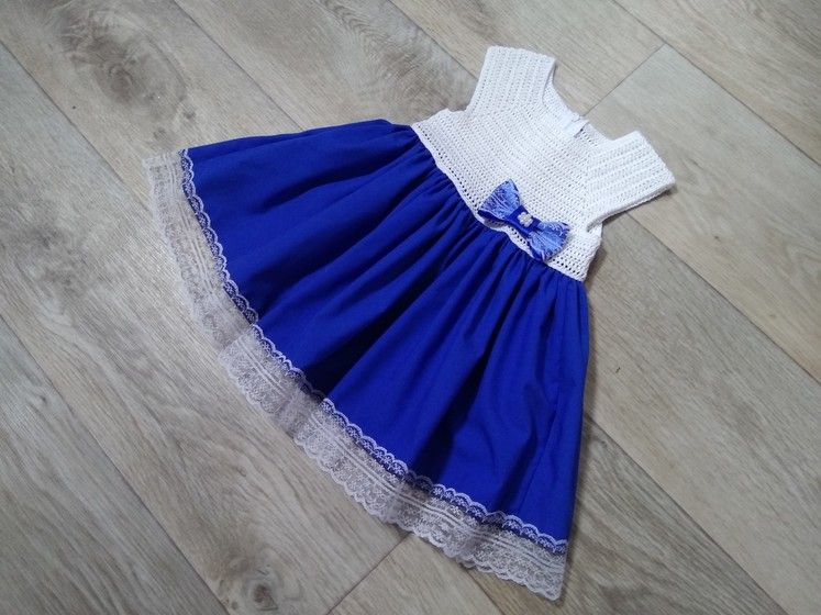 Платье для годовалой малышки. Кокетка связана пряжей «Ромашка», крючок #2. Немного ткани и кружева. Одно из моих любимых сочетаний цветов синий и белый)))