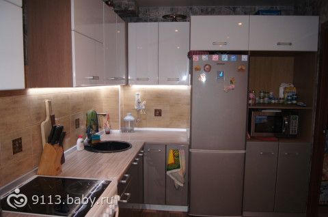 У меня на потолку 8 точечных светильников и по всей рабочей поверхности вот такая подсветочка, её установщики кухни делали! Ни каких массивных ламп только свет, при чём можно выбрать любой цветещё с права от холодильника приедут протянут, а то что то там темно