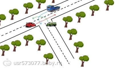И еще разок. Красный обязан пропустить зеленого, зеленый пропустить синего, соответственно синий проезжает первый, зеленый второй и только потом красный.