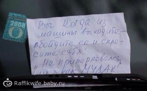 Парковка 7 марта 2014 12:59 Девчули, с праздником вас))) думаю для многих актуально))) я своему соседу хочу такую написать Комментарии Пожалуйста, будьте вежливы и доброжелательны к другим мамам и соблюдайте правила сообщества ПожаловатьсяСкопировать ссылку Юлия Максим14 летМихаил10 лет Самара Я оставляла примерно такую записку))) Пока эта машина больше так не парковалась))) ПожаловатьсяСкопировать ссылку Татьяна Сыночек12 лет Тольятти О дааа, у нас правда плохо трудно припарковаться, но отдельные особи есть ПожаловатьсяСкопировать ссылку Ксения Сало́ники в точку! ПожаловатьсяСкопировать ссылку Ната Кадулина Александр13 летАлексей5 лет Кстово я уже давно такие пишу, только в виде наклеек и посередине лобового стекла! ПожаловатьсяСкопировать ссылку annettochka Алексей10 летМаруся8 лет Москва Я половине соседей так написать хочу))) ПожаловатьсяСкопировать ссылку Елена Огурчик12 лет Санкт-Петербург баян, но иногда и правда хочется так сделать)) ПожаловатьсяСкопировать ссылку Анютины Глазки Димася14 лет Нижний Новгород ахааа ПожаловатьсяСкопировать ссылку Елена Анастасия21 годКирилл13 лет Нижний Новгород ПожаловатьсяСкопировать ссылку Chris tina Mitry14 летYasmina9 лет глупости ПожаловатьсяСкопировать ссылку rastishka Марк11 лет Люберцы у меня соседка свою коляску так паркует ПожаловатьсяСкопировать ссылку Светлана Тяпкина Иван17 летАрсений13 лет Горно-Алтайск ПожаловатьсяСкопировать ссылку КнижныйЧервь Владосик13 лет Новосибирск ПожаловатьсяСкопировать ссылку ПСС Москва Предыдущая статьяИз интернетаСледующая статьявопрос к автоледи)Актуальные постыкак давать коровье молоко ребенку 3 месяцау ребенка между пальцами рук покраснение