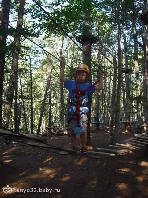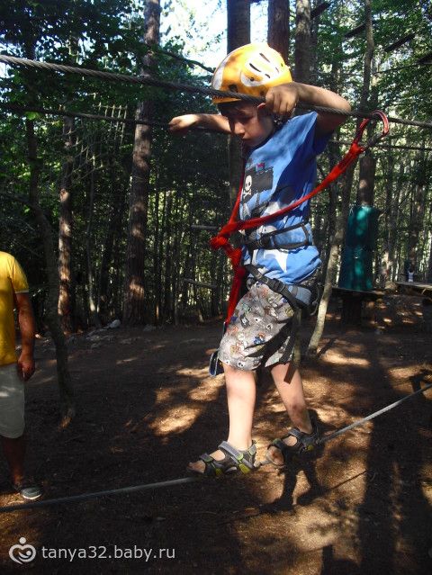 Еще мы ездили в национальный парк, на гору Ловчен. Там есть такие интересные развлечения для детей постарше — проходить всякие трассы, расположенные на деревьях на разных уровнях высоты. На ребенка надевают страховку и шлем и вперед! Мише очень понравилось)