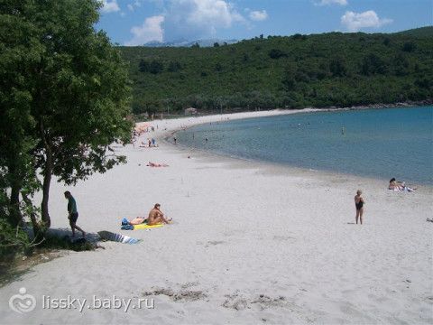 похожий на Трстено пляж (Плави горизонти) есть на п-ове Луштица — там тоже мельчайший белый песок и долгий пологий заход в море: