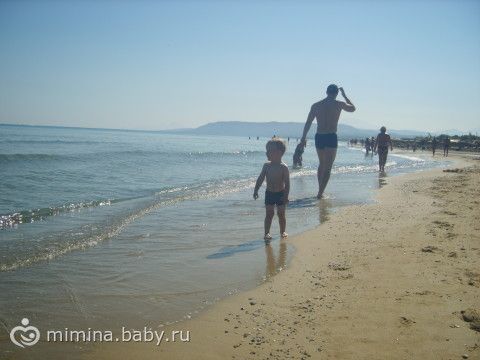 Пляжи по поселку есть и песчаные и галечные, на любой вкус. Нам по душе песочек, т.к. мне лично ноги больно по камням ходить… В нескольких местах там в море впадают горные речки, поэтому кое-где море холодновато. Но мы нашли место где нам очень нравилось. (у зеленых шезлонгов). Там песочек, очень плавный заход в море, нет камней и море теплое. Идеально для ребенка и для меня тоже)