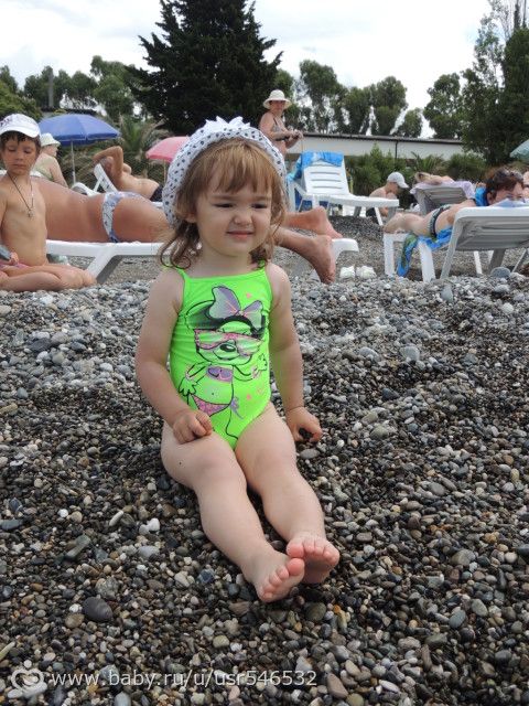 В первые дни, пока боялась воды, купили дочке бассейн небольшой, она там привыкала к морской водичке: