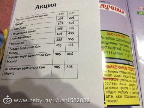 Мне понравилось то, что экскурсии там не утомительные — на полдня. Обзорная по Дубаю — начинается после обеда и до вечера. В основном там после обеда автобусы на шопинг по моллам всяким возят. Мы две экскурсии брали (озорная по Дубаю и в пустыню). Мы были с утра на пляже и до обеда, а вечером по городу гуляли сами, на метро катались (у них поезда без машиниста ездят), на Бурж Халифу, на золотой рынок ходили, на рыбный рынок — там мы пробовали мясо акулы, а ещё мы купили больших живых креветок и принесли их в свой отель — там нам их приготовили и принесли в номер). Я там купила себе классную дубленку ну и по мелочи много всего, подарки и сувениры. Многие там покупают шубы, кожу, технику. В аэропорту каждый второй ехал домой с телевизором. Ещё там народ покупает ковры, телефоны, ну и само собой золото. Везти с собой надо доллары, их там можно поменять на каждом углу в пункте обмена на их дирхамы. У нас в отеле было 2 разовое питание — завтрак и обед. Ужинали либо в своём ресторане за отдельную плату, либо в других заведениях. Насчет питания — есть там можно везде и не бояться, что отравитесь — там с этим очень строго. Алкоголь там не продается, только в ресторанах дорогих отелей по бешеным ценам. Так что если нужно — покупайте в Дьюти фри. Поездка нам вышла нет так уж и дорого, так как мы брали недорогой городской отель без собственного пляжа (на пляж нас каждый день возили автобусы). Мы на экскурсии и шопинг потратили гораздо больше, чем перелет и проживание-питание в отеле.