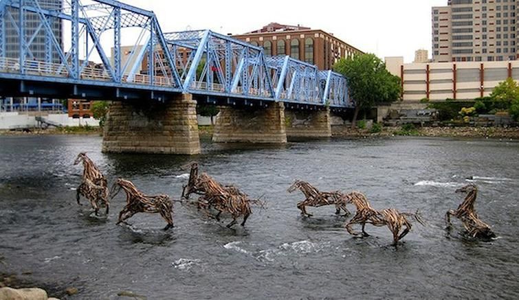 Эти скульптуры создал Ричард Морс. Его инсталляция представляет собой скульптуры лошадей в натуральную величину, сделанные из мертвых яблочных деревьев, и установленные в реке Гранд. Эта инсталляция символизирует борьбу и сохранение, через которые мы все должны пройти во время сложных ситуаций.