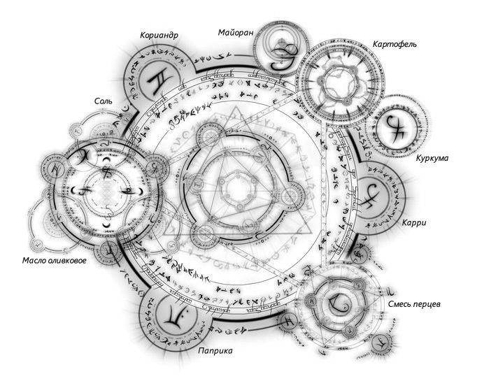 Круги и размеры кодируют компоненты, пересечения и орнаменты — процессы смешивания готовки.