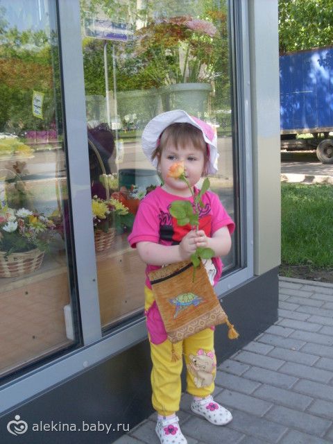 Соня подбежала к палатке с цветами и стала любоваться! В итоге продавец подарил ей цветочке!