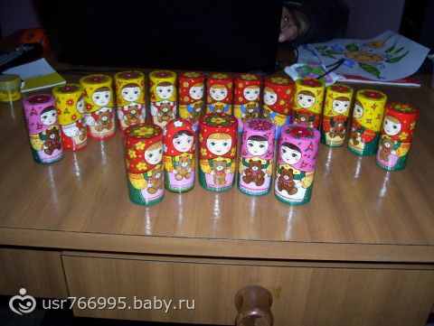 Живу я в Италии. у них принято на каждое событие дарить всем друзьям и родственникам маленький памятный подарок — бомбоньеру. чаще всего бомбоньеры это китайские безделушки которые можно сразу в урну. бомбоньеры делают и на свадьбу и на рождение ребенка, на крестины, на годовщину какого либо события и даже на получение диплома… Я увидела бомбоньеры в магазине, мне они не понравились, и тогда решила сделать сама. хоть останется на память что то красивое родственникам. поскольку я очень люблю рисовать (особенно роспись по дереву) решила сделать подобие матрешек. но не буду же я матрешки покупать (а их здесь и не купишь!) ведь бомбоньер надо штук 30 сделать а то и больше. купили черенок для лопаты, распилили на цилиндрики и вот что получилось! (краска темпера, 3 слоя лака обычного пф)