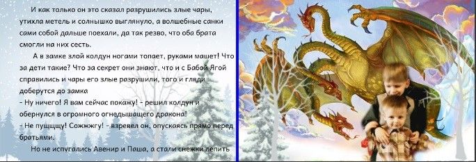 Книги, где главными героями стали мои дети, получилась по-настоящему фантастической. Старший сын был в неописуемом восторге. Он очень долго был под впечатлением от содержания сказки и пересматривал иллюстрации много раз.
