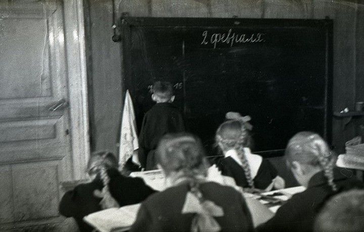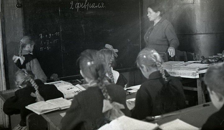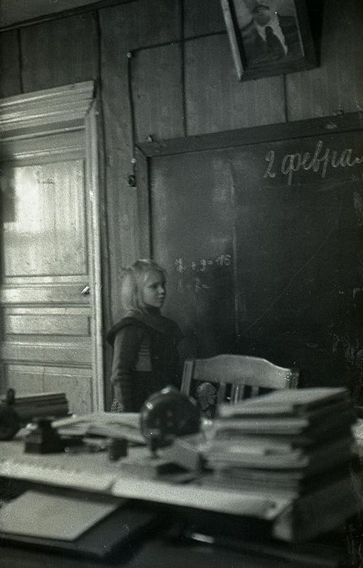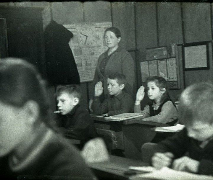 Урок в начальной сельской школе 1964 года. “Ученики с первого по четвертый класс в одной комнате, – пишет автор фотографий Людмила Таболина. – Девочки с одинаковыми косичками. Круглая печка-голландка. Пальтишки и шапки на вешалке в углу…”