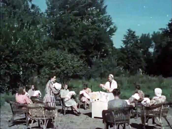 Работница санатория объясняет на кукле, как надо пеленать ребенка: