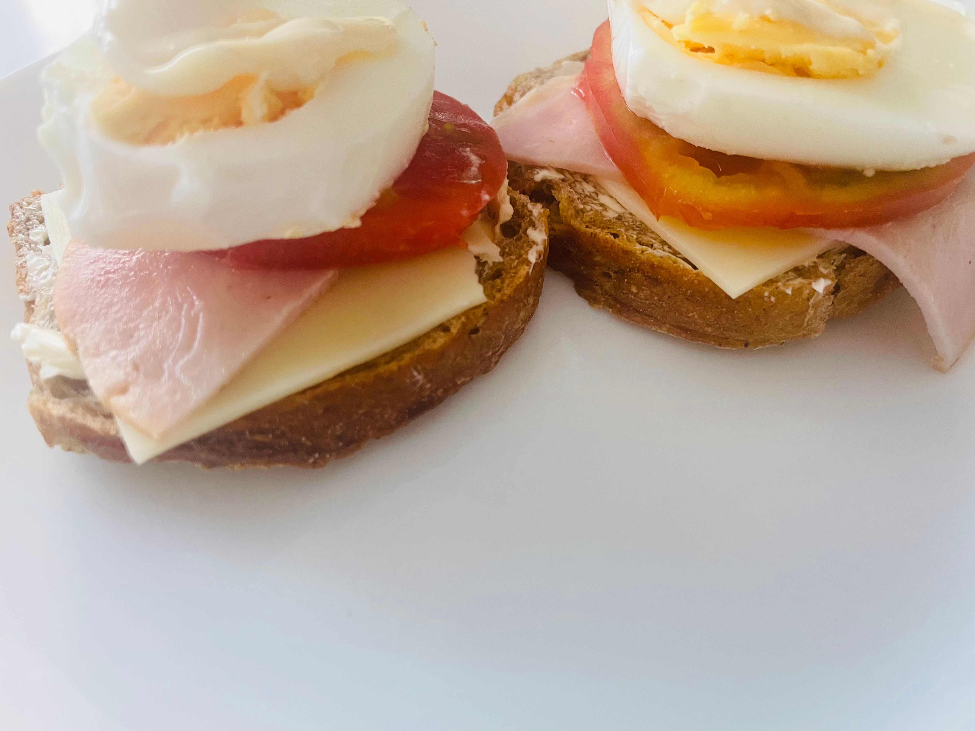 Варëные яйца с помидором или огурцом, бутеры с маслом и сыром, иногда с мясом или ветчиной.