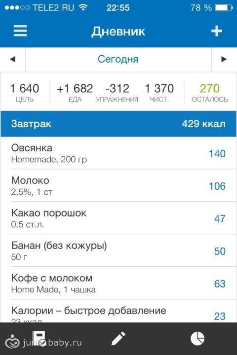 диеты все на фиг, только правильное питание (дальше-ПП), в общем за месяц правильного питания (без масла, хлеба, жареного, жирного, сахара, картофеля, муки и макарон) я скидываю 5 кг. Решила для себя так: не хочу быть худой, хочу мышцы, попу, ноги. Но жира у меня много, решила согнать жир, потом уже набирать мышечную массу. Устанавливаю себе на телефон приложение-калоризатор, сжигаю больше ккал, чем потребляю.