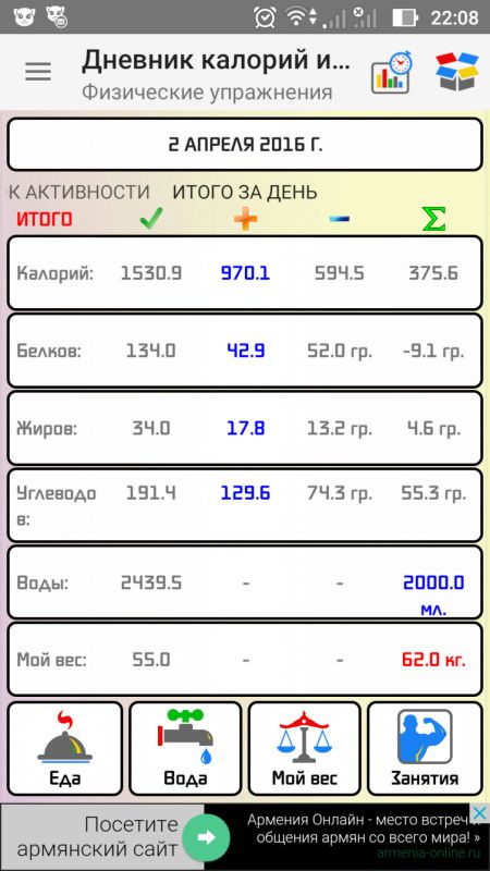 Девочки, сегодня начала придерживаться правильного питания и заниматься спортом дома… включила дневник, все записывала, и у меня вышло вместе с занятиями (их было два, днем и вечером с д.майклс), что в сумме ккал 375 (макс.1600) а белки воо.ще на минус ушли, хотя я ела, завтрак каша овсяная, обед 2 рыбные котлетки и салат, ужин мацони и печеное яблоко, не перекусывала только(. Ничего страшного не будет что у меня такие цыфры