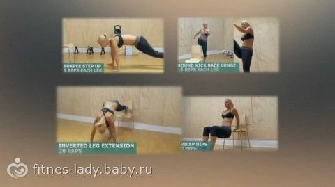 1) Бурпи с подъемом на ступеньку — по 5 шагов на каждую ногу. Поставьте стул под стену, чтобы он был более устойчивым, станьте напротив стула и выполните бурпи. В прыжке примите позицию в упоре лежа, держите тела прямо, выполните отжимание, прыжок вперед, прыжок вверх, станьте напротив стула, станьте одной ногой на стул и поднимитесь. У вас получится 5 шагов на правую ногу и 5 на левую. Все время держите спину ровно и пресс напряженным, плечи назад.
