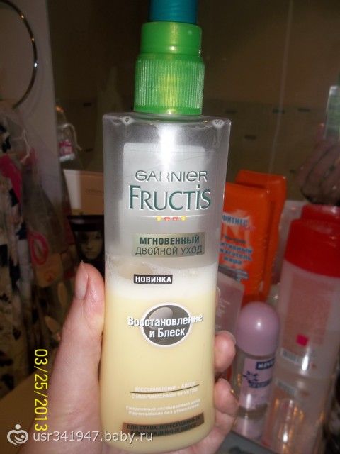 Никакого блеска даже оно не придает и уж тем более ничего не восстанавливает! Что до нанесения что после на вид разницы никакой нет вообще! Больше фруктисы брать вообще не буду! Шампунь и бальзам кстати тоже ожиданий не оправдали, от бальзама волосы вообще склеиваются как от клея ПВА! Выкинула вообще его. Дешевая чистая линия и Агафья будут намного получше даже этого фруктиса. Ну все индивидуально конечно.