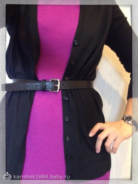 Если Вы считаете, что Ваша талия в форме, то внутрь можно добавить ремень. Но не нового цвета, а в тон кардигана. В данном случае, черного. Так как талия — не наша сильная сторона, мы подбираем спокойную пряжку, гладкую кожу ремня.