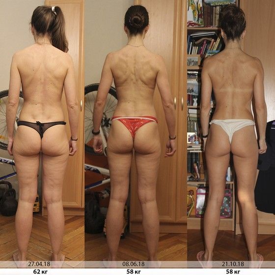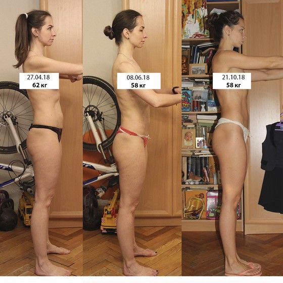 По коллажам: апрель -это пик запустения себя (комп+кресло, передвижения только на авто, винишко, макдак, пица и прочее), июнь-это уже тренажерный зал 3 раза в неделю, интервальный бег в парке 2-3 раза (это отдельная история), правильное питание с дефицитом калорий. Потом перерыв летом в 2 месяца-только много ходьбы, плаванье в море и озере, езда на велике. Питание правильное, но каждый день по 100 гр шоколада с орехами на ночь с книжечкой (ну я реально много пешком ходила, можно))). Ну и сентябрь и октябрь снова в режиме спорта-3 раза в неделю силовые и работаю на мышечную массу.С едой часто грешу-раз, два в неделю ем что то неправильное (сладкое, мучное, но без фанатизма). Но результат есть)))