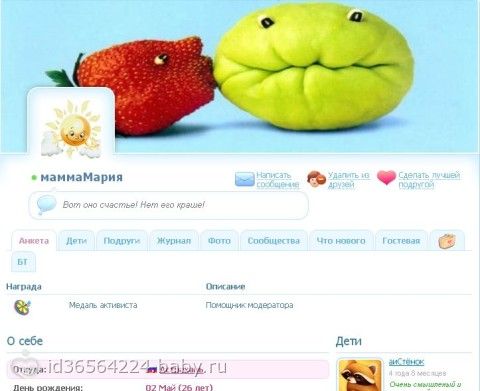 Например, Юля — самомама, мама Софии; Оксаночка, которая пережила потерю малыша; Марина – активная и интересная многомамочка; Анечка из Тольятти, кажется, я знаю ее давно )), Марина, у которой наконец-то случилось чудо, и этому чуду уже 19 недель; Света, за которую я радуюсь и переживаю; и каждая другая подружка в той или иной мере ).