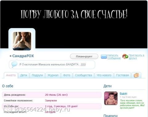 На бэбик попала случайно, узнать про какашечки, колики и всякое такое! и вот зависла здесь теперь, не могла дождаться, когда же вернусь с дачи, чтобы быстрее уделить время последним новостям от мамулечек))) Подружки появились, хоть и не с одной не виделась в жизни, но в виртуальной жизни рада, что они есть, и я по ним скучаю, по их постам, по их деткам, фоточкам… Особенно люблю Женечку из Казани, Владу, Графиньку с Данькой из Москвы, Катюшку с Сашулькой из Балашихи, Бусю из Гомеля, Сашулю из Смоленска, Рыжика… и много много кого)))) Девочки, всех вас люблю))))