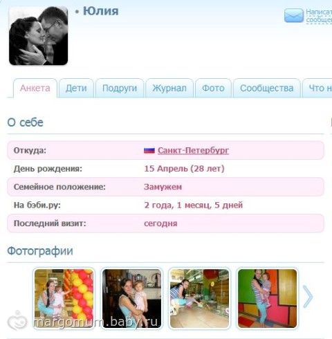 Да, есть девушки, с которыми сложились очень доверительные отношения. С некоторыми встречаемся в жизни. Радует то, что приятное впечатление от переписки, имеет аналогичное продолжение в личных встречах. Еще пара бэбирушек «из далеких краев», которые меня очень поддерживают, переживают за неудачи и радуются успехам, от их участия мне становится тепло и спокойно. Я очень рада, что есть такой ресурс. Потому что, все наши «мамские» бесконечные ребеночно — бытовые — мужнины проблемы, интересны только декретным «дамам», а таких в моем «рационе», почти нет. Так что, бэби.ру стал моей отдушиной.