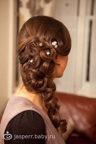 не видя платье сложно сказать))) я доверила свою голову только парикмахеру, подружки такое советовали! изначально не хотела огромных кудрей над башкой и по боками, в итоге сделали три небольших цветочка из косичек на затылке и локоны внизу (выпрямителем). Не могу найти фотку прически, вот так примерно это выглядело)))