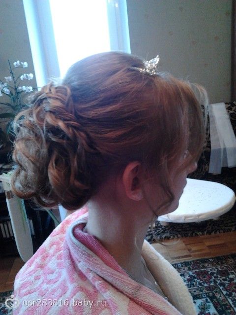 Всё было предельно просто. А вот фату цепляла сама и на то, что было под рукой, ибо в суете за главным позабыла про мелочи, а когда вспомнила было поздно) Поэтому фата «растет из ниоткуда»Пы.Сы.: на фото волос цвета кирпича