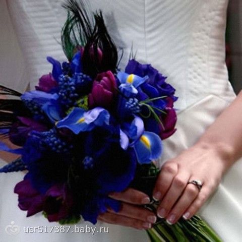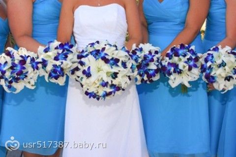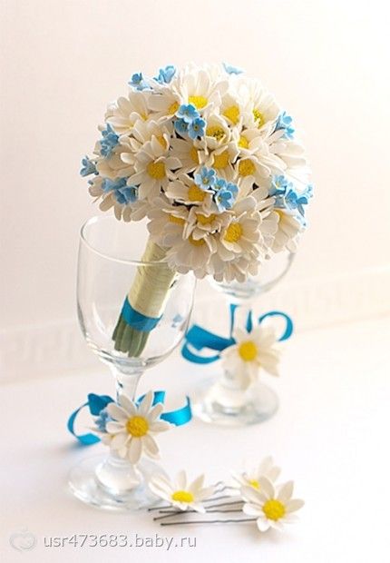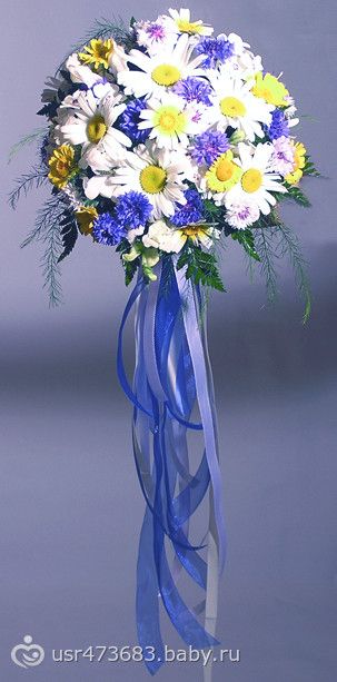 А вот синий тоже ничего прям так… Когда просто синий — как-то мрачно, а когда его немного и с белым разбавлен, то очень даже… Может и правда смешать его с белым и добавить немного ромашек ))) Букет мне понравился, сам белый и совсем немного синих ноток — очень гармонично смотрится. вот например такой сделать, только вместо голубых цветочков синие вставить: