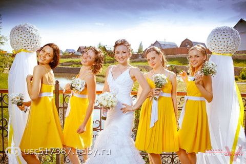 Желтый— несёт в себе светлое и гармоничное начало. Этот цвет любят активные и оптимистичные люди. Он также трактуется как цвет озарения. Боги часто изображались с помощью жёлтой краски — оттенок надмирности, высшей власти. Гёте в своем учении о цвете называл жёлтый «весёлым, светлым, чистым, ясным, бодрым, живым и нежным». Свадьба в жёлтом цвете подойдёт открытым людям, которые свободны от мрачных стереотипов, любят новые идеи и непринуждённое общение. Желтая свадьба — к гармонии в семье!