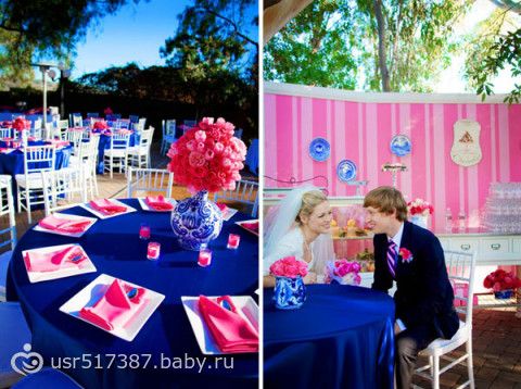 Не не, с голубым мне не нравится, просто сам букет милый, вот если б эти маленькие голубенькие цветочки в нем заменить на синий и наверно ленты добавить синие и белые свисающие, то будет именно то, что по мне. А в плане оформления, деревянных столов я не хочу ни в коем случае, понравилось что-то типа такого и добавить шариков