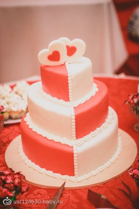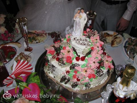 а у нас была красно-белая свадьба и тортик соответствующий, трех-слойный, морковно-бисквитный, абрикос, и итальянский бисквит, оч вкусно, и еще были капкейки