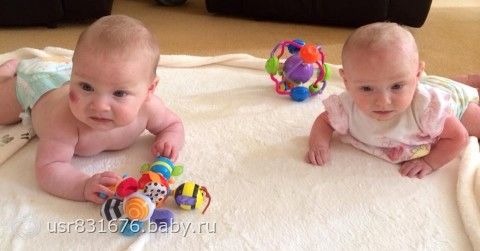 Вес мы набирали не очень и сейчас мы не очень большие. Примерно 7,5 и 5 кг. Развиты вроде нормально. Переворачиваемся во все стороны и очень часто, ползем по пластунски и встаем на коленки, раскачиваемся, Адриана сидит иногда без поддержки, но в основном ей надо еще держаться за что-то, смеемся, улыбаемся, узнаем своих и чужих, откликаемся на имена, держим сами бутылочку и пьем из нее, если выпала можем поднять и в ротик назад положить, тоже самое в пустышкой, издаем очень много разных звуков, берем ножки в ручки и в ротик. Может еще что-то забыла. И вот фото 1,5 месяца и сейчас. Спасибо всем, кто дочитал. Подружки знают эту историю, но может все равно интересно )