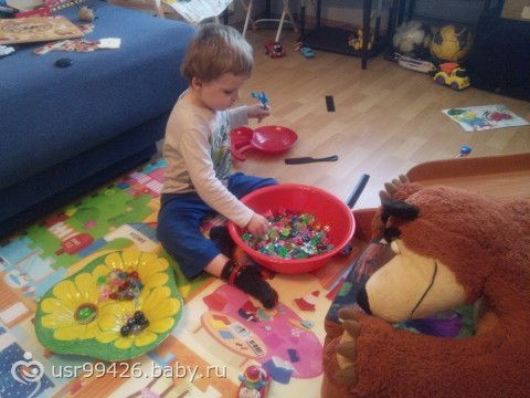 В свое время ни крупы, ни пуговицы у нас не пошли, поэтому мы их заменили вот такими фигурками, покупали в магазине всё по 38 руб. Ребенок довольный и иногда за перебиранием может просидеть до 40-50 минут, пока все не переберет..., так же подходит для изготовления поделок и картинок