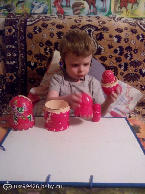 Ещё в ход пошли колючие бусики, наматывает их на руки, разбрасывает и получает постоянное со прикасание с очень мелкими камушками. На ура пошла матрешка, целыми днями бы её разбирал, поэтому у нас игра я собираю, он как увидит, что она собрана сразу начинает разбирать, с большим удовольствием слушает, когда ему объясняю, что это большая матрешка, а это маленькая, мы даже улыбаться начали маленькой матрешке. Ну и по вставлять в пластилин спички, нам тоже очень нравится, за одно получаем ёжика.