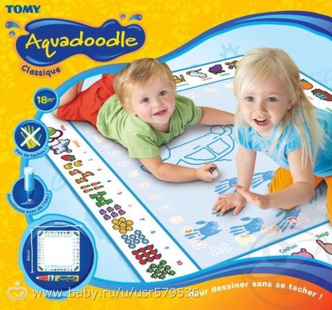 1. Коврик для рисованияводой Tomy Аквадудл. Рисовать на напольном коврике можно специальными маркерами-карандашами (есть в комплекте), обычными кисточками или ладошками, смоченными в воде. Рисунки на безопасном коврике высыхают за 7–10 минут, по краям поверхности для творчества есть цифры и английские буквы, которые при намокании проявляются.