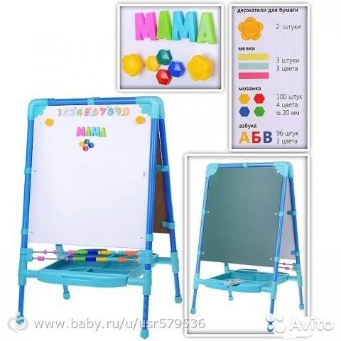 2. Мольберт двухсторонний растущий, со счётами, с большим пеналом, магнитными буквами, цифрами и мозаикой.