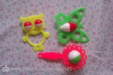 Купила лёгкие погремушки, как на фото выше, подвесную погремушку на коляску, ещё на кроватку куплю. Также взяла браслетики-погремушки. В планах мобиль и прорезыватели.