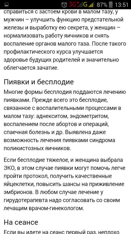 Я второй курс прошла Ставили на разные органы, в т.ч. на шейку матки. Кровит из разных мест по-разному. Иногда я только успевала доехать до дома, даже джинсы успевала запачкать. Результат уже виден на узи — эндик немного утолщился, а вот насчет кровотока я пока не знаю — скоро буду делать узи кровотока в матке. Но перед ЭКО планирую пройти ещё одни курс пиявочек.