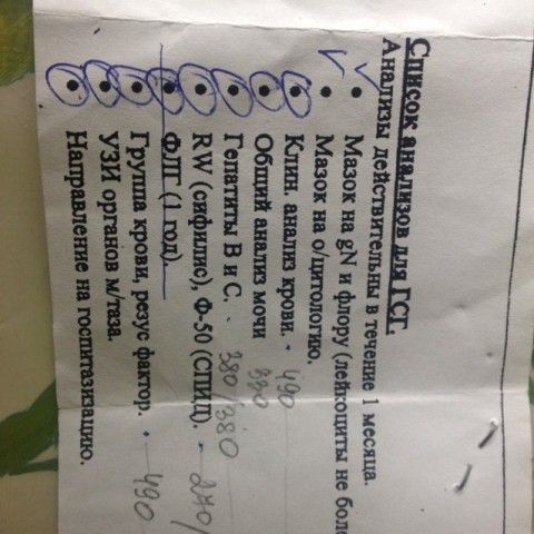 Кровь: гепатит, сифилис, вич и мазок. У меня ещё был с собой клинический анализ крови — все смотрели и копии оставили себе. И если анализы будут плохие то гсг никто не сделает, потому что есть риск занести "заразу" с полость матки. Делала гсг в клинике "Чудо Доктор" — осталась довольна и врачом и результатом!