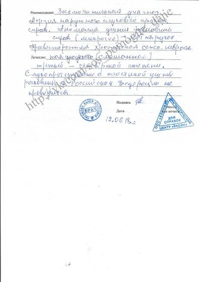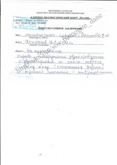 Диагноз: Атрезия наружнего слухового прохода справа, микротия ушной раковины справа, правосторонняя хроническая сенсо-невральная тугоухость (смешанная) 3-4 степени