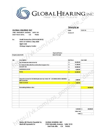 Нам выслали счет – 85000 $ или 5 865 000 рублей (по курсу 1 $ = 69 руб.) Но это огромная и неподъемная сумма для нас. Нам просто негде взять такие деньги! Мы с семьей живем в однокомнатной квартире, нас четверо: мы с женой и 2 сына. Работаю только я, супруга находится в отпуске по уходу за ребенком (младшему сыну 1 год). Чтобы зафиксировать стоимость операции, в декабре 2018 года мы внесли депозит в размере 5 000 $. Мы очень хотим, чтобы наш сын полноценно слышал, и у него были два одинаковых ушка! Очень надеемся на помощь! Пожалуйста, помогите Дане обрести здоровое детство и светлое будущее без осложнений и комплексов!!!