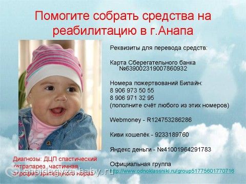 Чтобы ребёнку помочь стать полноценным ребёнком, начать правильно развиваться: сидеть, ползать на коленках, ходить и т.д. На это нужны не малые деньги, а воспитываю я её одна, так как мать-одиночка. Я не прошу огромных сумм денег, кто сколько сможет, ведь 50 рублей это тоже деньги. Прошу отнестись к моему горю с пониманием. Фамилия моя Карлионе Наталья Николаевна 05.09.1987 года рождения, сотовый телефон 89233189760, скайп Kar-li-one.